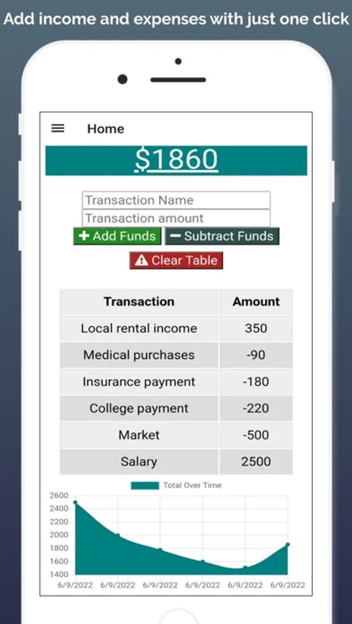 Both the table and graph are updated accordingly when the user clicks "Add Funds" or "Subtract Funds"