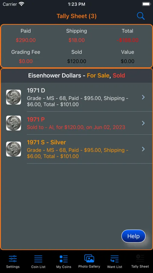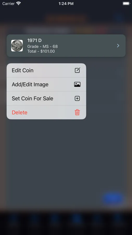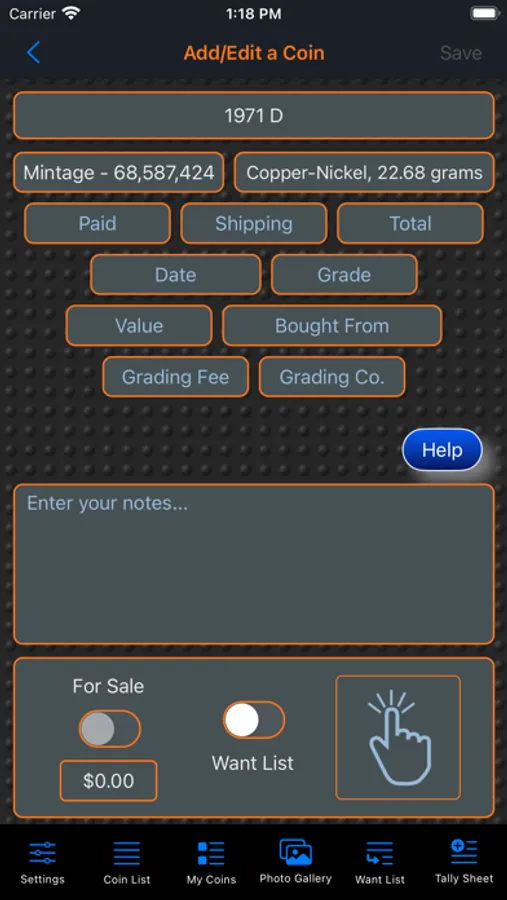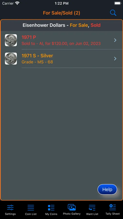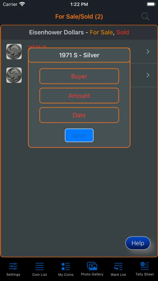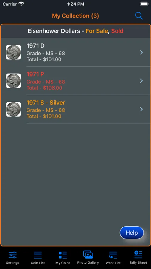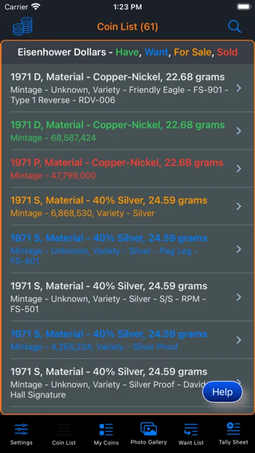 This app will provide the ability for the user to organize, track and manage their collection of coins. Images of each coin can be included with the collection. There is also a means within the app for the user to peruse all of the images in an entertaining manner. The app has three (3) color themes which help to make the app more enjoyable. A running tally of the cost for the entire collection is provided. A want list is also included in the app to allow you to ear-mark coins that you are searching for.