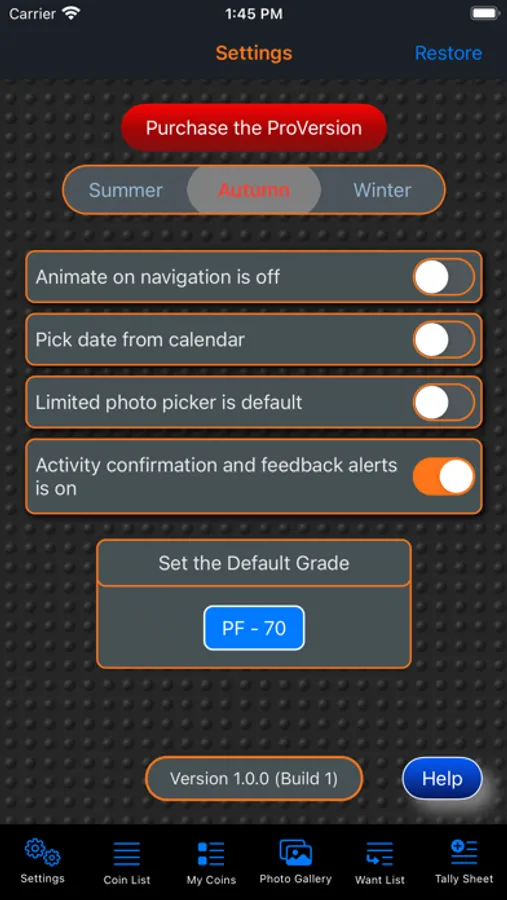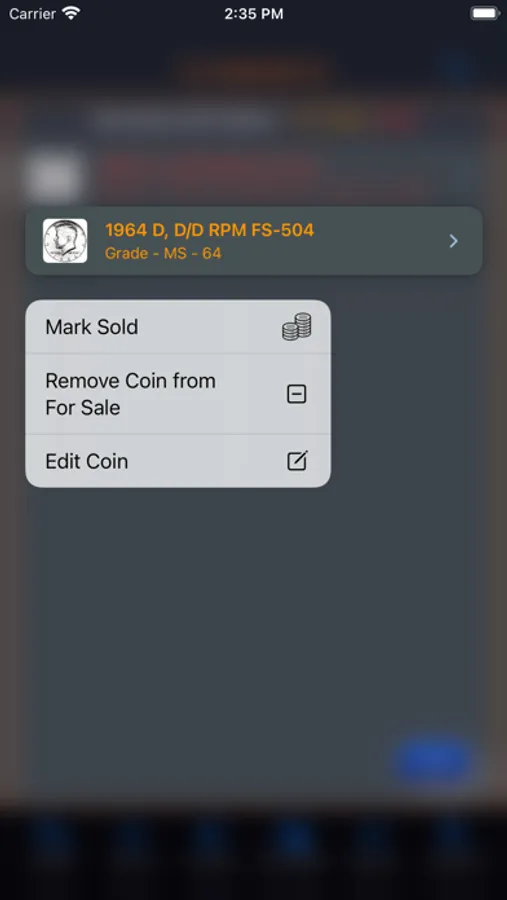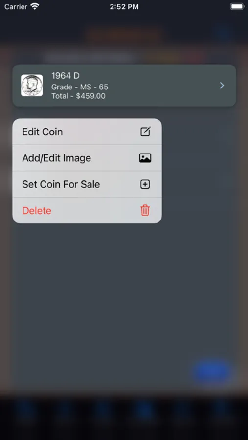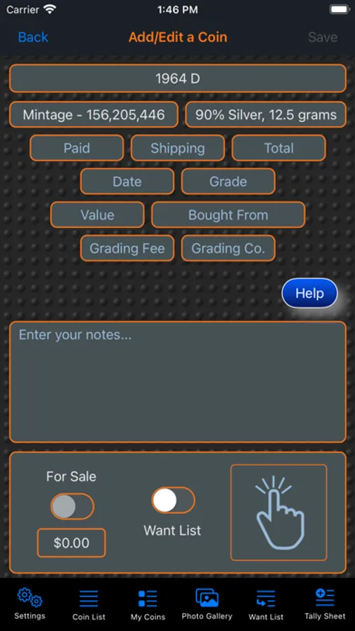 This app will provide the ability for the user to organize, track and manage their collection of coins. Images of each coin can be included with the collection. There is also a means within the app for the user to peruse all of the images in an entertaining manner. The app has three (3) color themes which help to make the app more enjoyable. A running tally of the cost for the entire collection is provided. A want list is also included in the app to allow you to ear-mark coins that you are searching for.