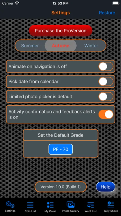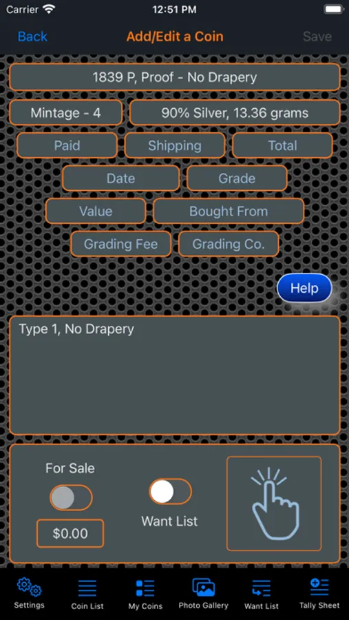 This app will provide the ability for the user to organize, track and manage their collection of coins. Images of each coin can be included with the collection. There is also a means within the app for the user to peruse all of the images in an entertaining manner. The app has three (3) color themes which help to make the app more enjoyable. A running tally of the cost for the entire collection is provided. A want list is also included in the app to allow you to ear-mark coins that you are searching for.