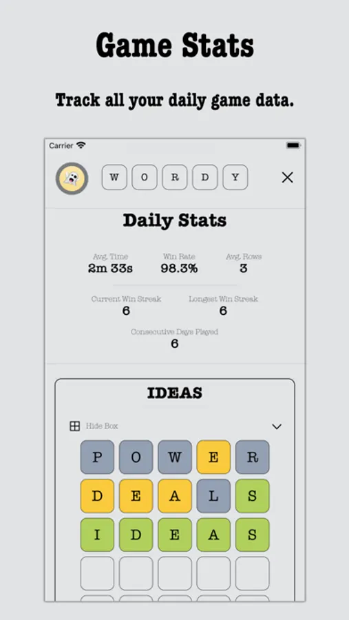 Stats Page: Keep tabs on your word wisdom with our comprehensive Stats Page. Watch as your word knowledge expands, track your daily games progress, and set new word-wonder goals. Your journey to becoming a master wordsmith is always at your fingertips!