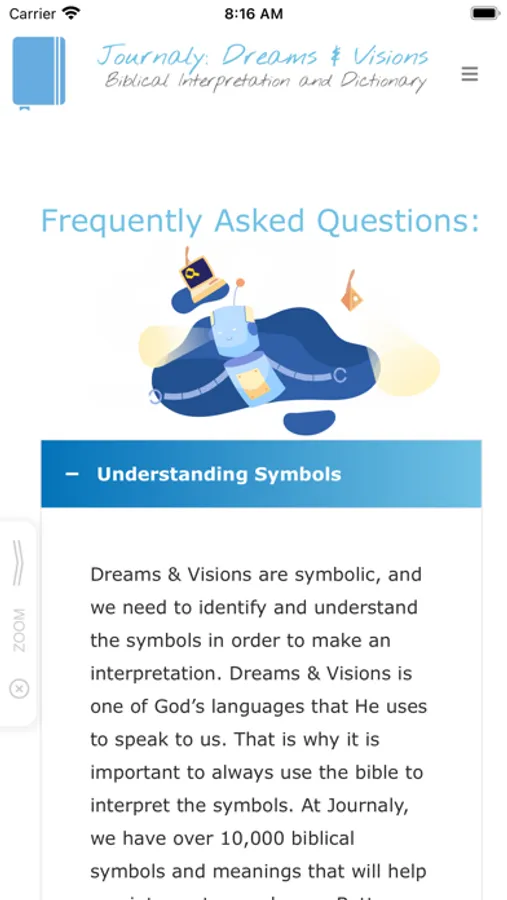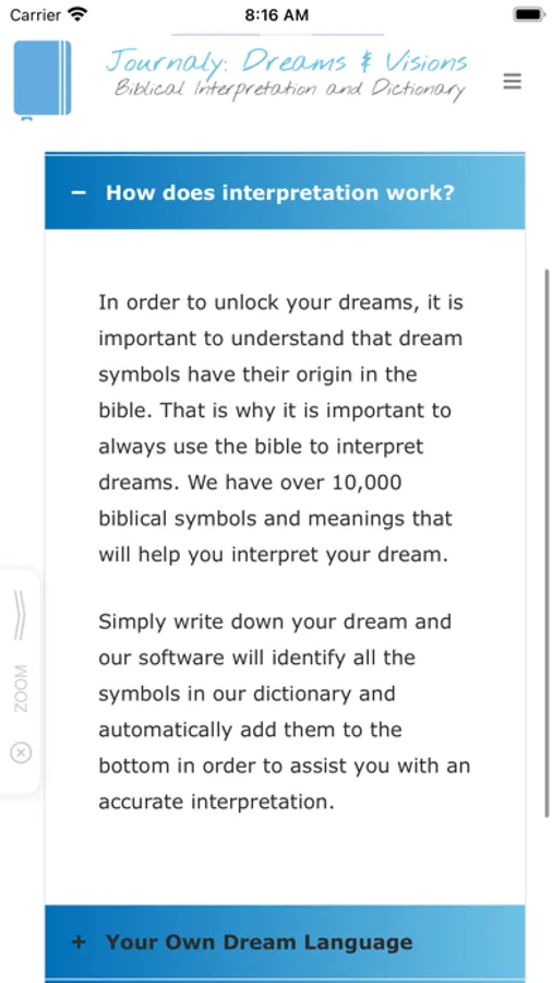 We have created the most comprehensive Dream Dictionary that has ever existed, using the bible as its origins. Our app will analyze your Dream or Vision and list all the symbols found along with their definitions and meanings. Once all the symbols are translated, it is easy to interpret the dream.