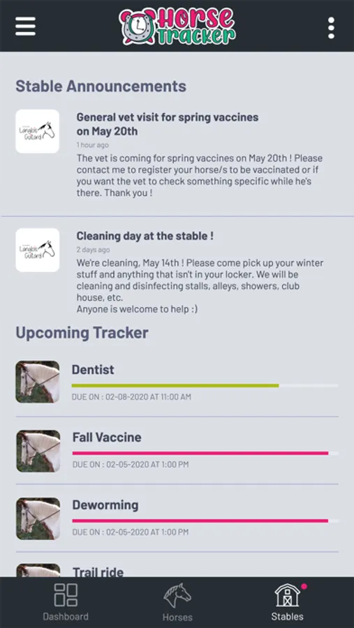 You can add your stable to Horse Tracker and invite all your boarders to become a stable member and share their horses with you! You'll be able to see all the horses and owners informations, manage and create trackers for them and also edit the care info (hay, grain, medication and supplements) as needed.