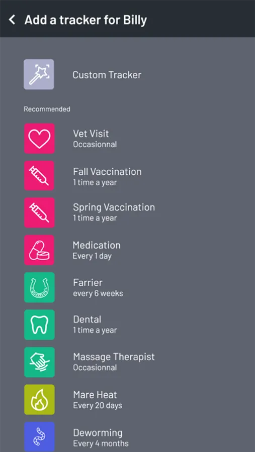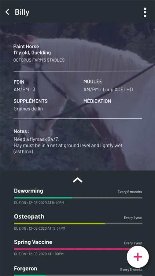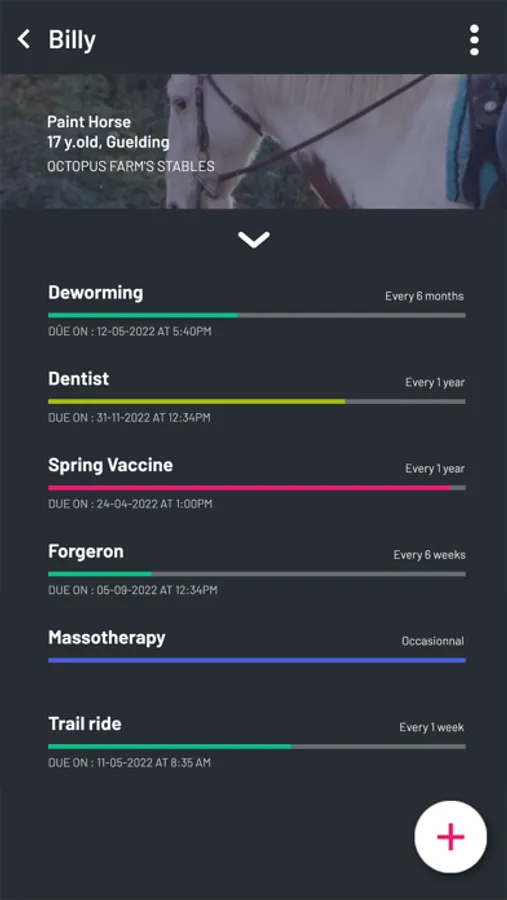You can add any occasionnal or recurrent task you need to provide to your equine friend such as hoof care, deworming, vaccinations, vet visits or anything else you want: set a schedule and start tracking! You can share your horse's profile to whoever you want and set roles such as : co-owner, trainer or rider (perfect for horses that are half-leased) and manage their permission level.