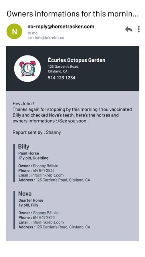 As a stable owner you'll also be able to add Contacts to your stable and send reports to them. When you create a report, you can select the horses you want to include and it will automatically add the horse's info and their owner's info. Ideal when for example: your vet comes for some horses and they need their owner's info for billing.