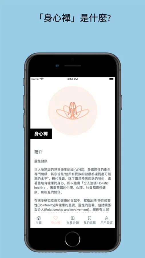 「身心禪」是為所有人設計的身心運動(mind body meditation),內容包括一系列的心理健康教育和靜修練習,可以促進身心健康,優化情緒,提升生命價值和改善人際關係。「身心襌」的特點是身心並重的運動,身心禪的心法是修身可以調心,養性可以養生。整套運動包括「每日一事」、「靜修運動」和「全心運動」。「每日一事」是利用日常的行為訓練,來轉化自己的壞習慣。「靜修運動」是在行住坐卧中習禪。