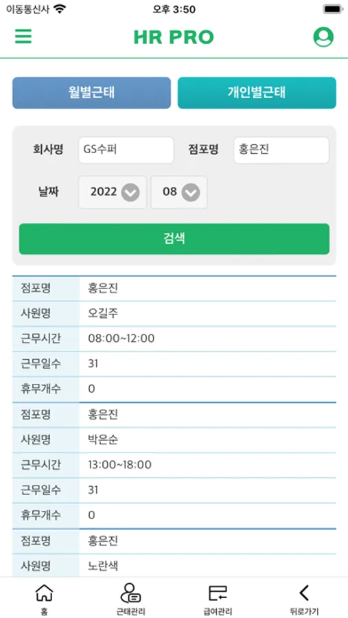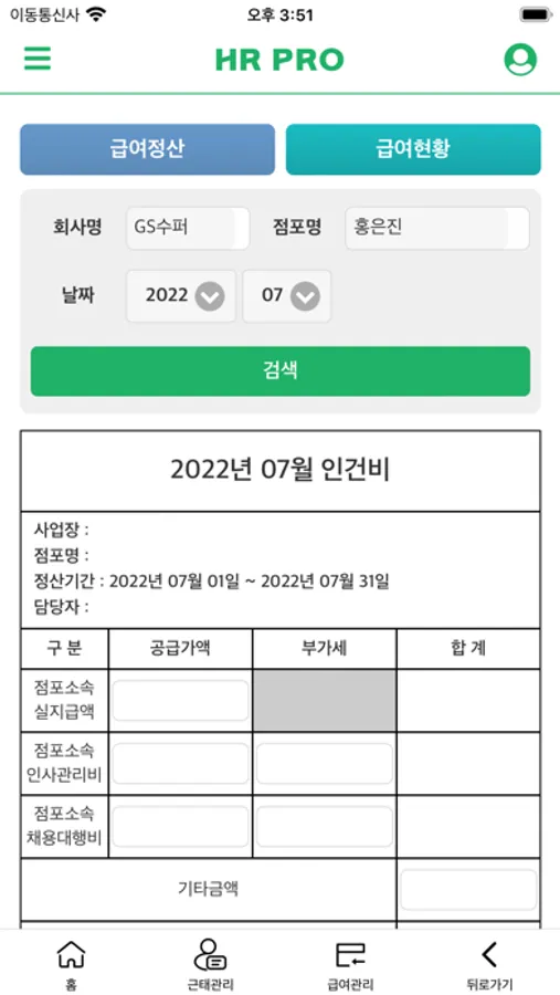 - 사업장 내 직원별, 월별 인건비 처리 및 조회기능