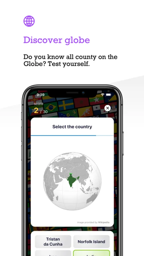 This quiz game based on our Globe. Do you know all territories, country flags, emblems, capitals? You can check it in few minutes. Different game modes will improve your knowledge about world countries and it's symbols. It is suitable for kids to improve memory skills while playing "country flag" mode -- mode where you should find flag for certain country or it's name for a flag image.