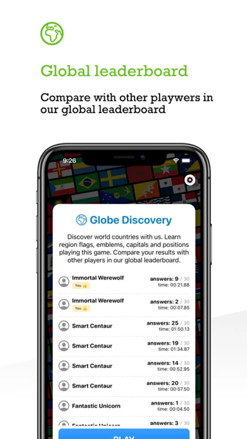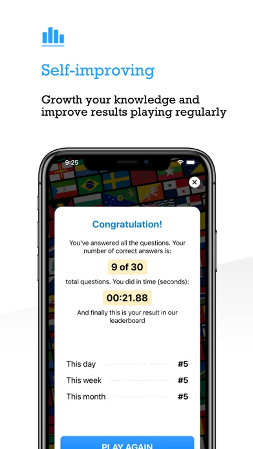 Our global leaderboard will show your results compared with other players. Try to be #1 in the last day, week or even month. It's based on correctness of your answers and time you spent answering all the questions.