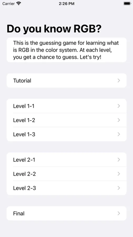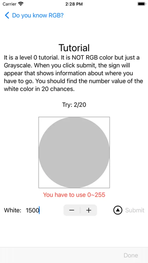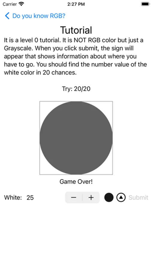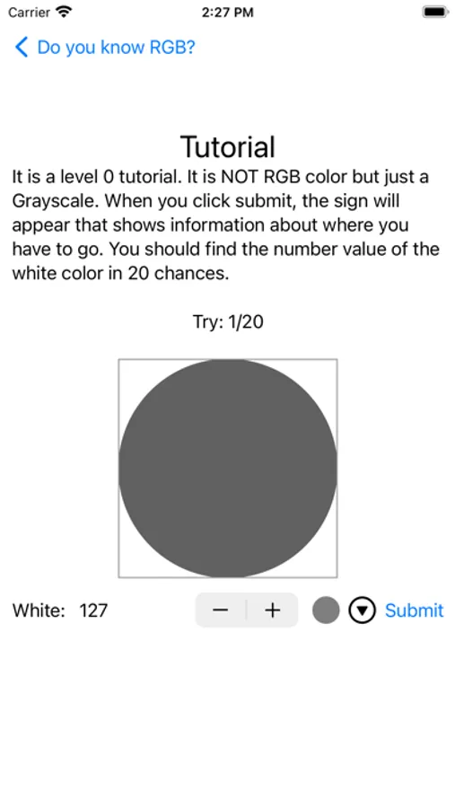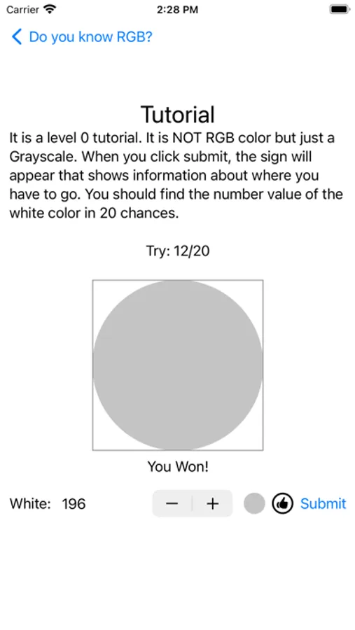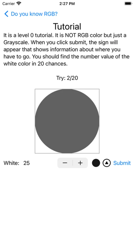 Select your level and guessing the value of color. Use stepper or typo the color value of circle. You got the correct value in chances, you win. Enjoy and play.