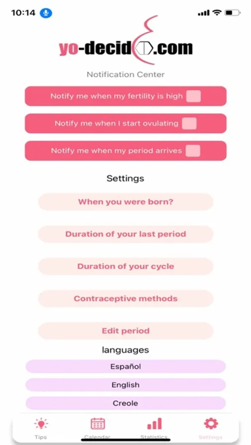 Ingresa tu fecha de nacimiento, la fecha de tu último periodo, duración de tu siclo y resto lo hará yo decido app, será tu mejor compañera durante todo el año, Disponible en 3 idiomas, español, inglés y creole.
