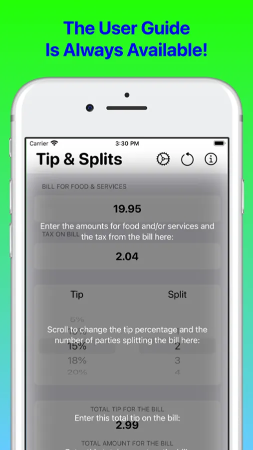 • Use the reset button to quickly clear your entries and return to your default tip and split values.