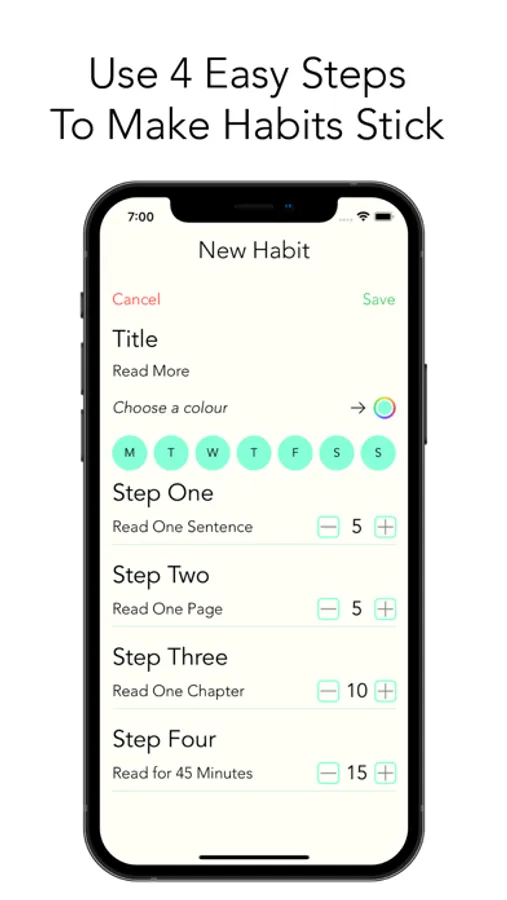 Getting new habits to stick is hard because we have limited time and willpower. 4 Steps uses a tried and tested method of breaking your habits down into 4 smaller habits - This makes it much easier to integrate them into your busy day. Many habit building apps are bloated with features and information that are distracting and don’t form an effective approach to habit building. 4 Steps takes a different approach, having a simple and user friendly interface, that saves you time and allows you to focus on the important parts of habit building.