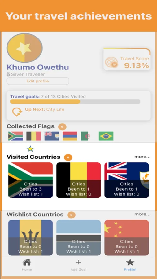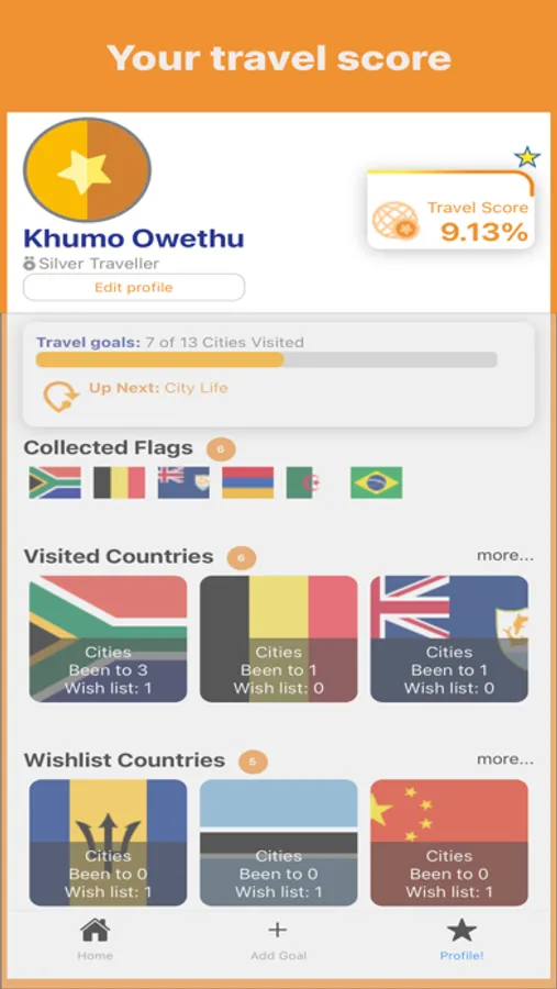 Travel Score and Travel Goals progress are the main features that encourages you to start planning your next holiday.