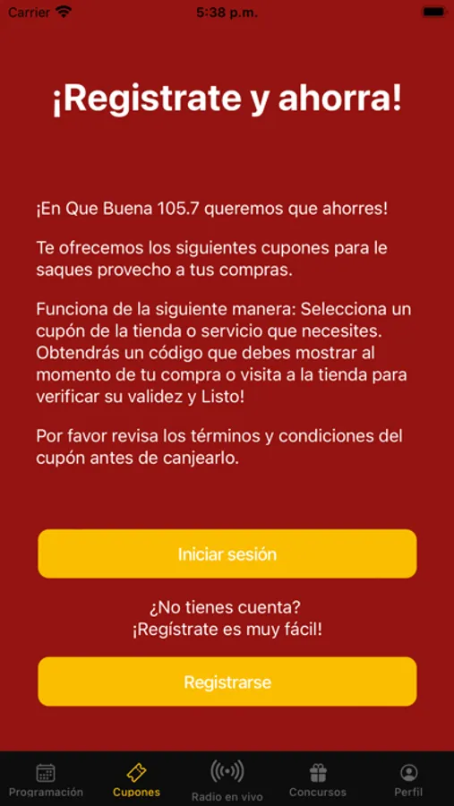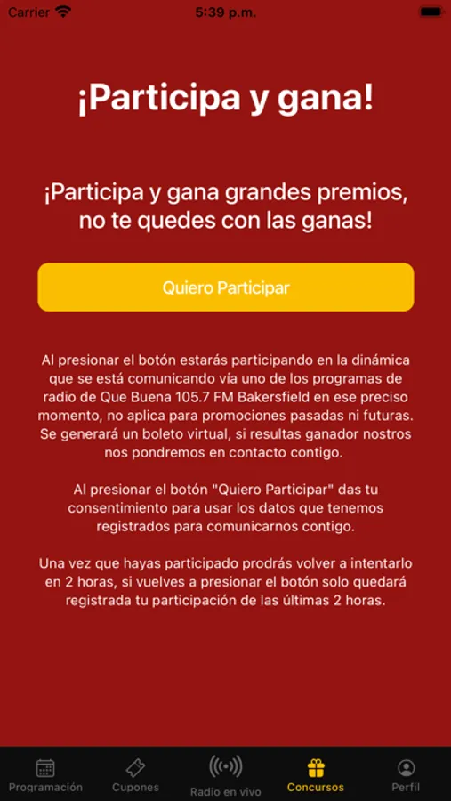 Con la App de Que Buena 105.7 FM Bakersfield podrás escuchar música completamente en vivo, consultar los horarios de tus programas favoritos, participar en concursos y disfrutar de descuentos increíbles.