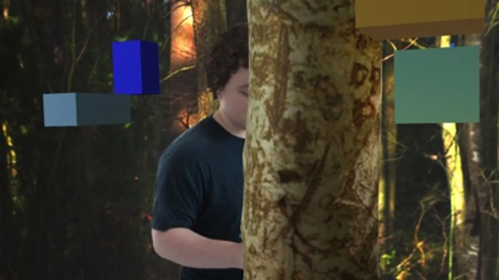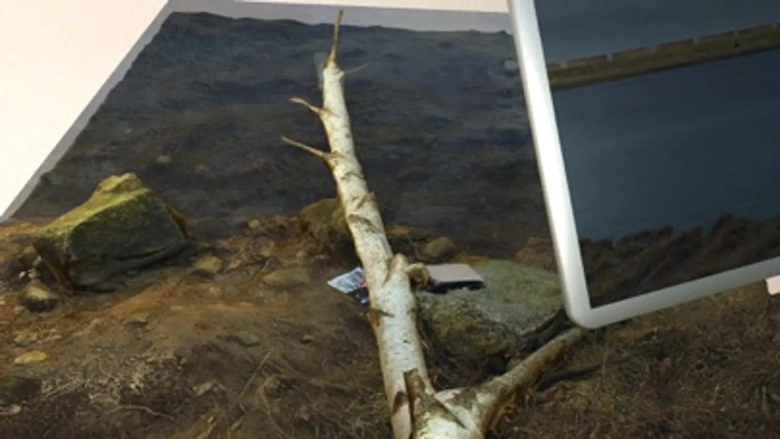 Viewers can scan the photographs: “The Carved Tree” or “The River Edge” in the gallery space using the App, and interact with the scene in Augmented Reality to reframe the composition from different points of view. Through this virtual view, viewers can move in for a closer look, or look behind objects to reveal elements not initially visible in the original photo. Ironically, since the viewer must move around the photograph to fully see it, this virtual medium creates the potential for active, physical interactions with the immaterial digital capture.