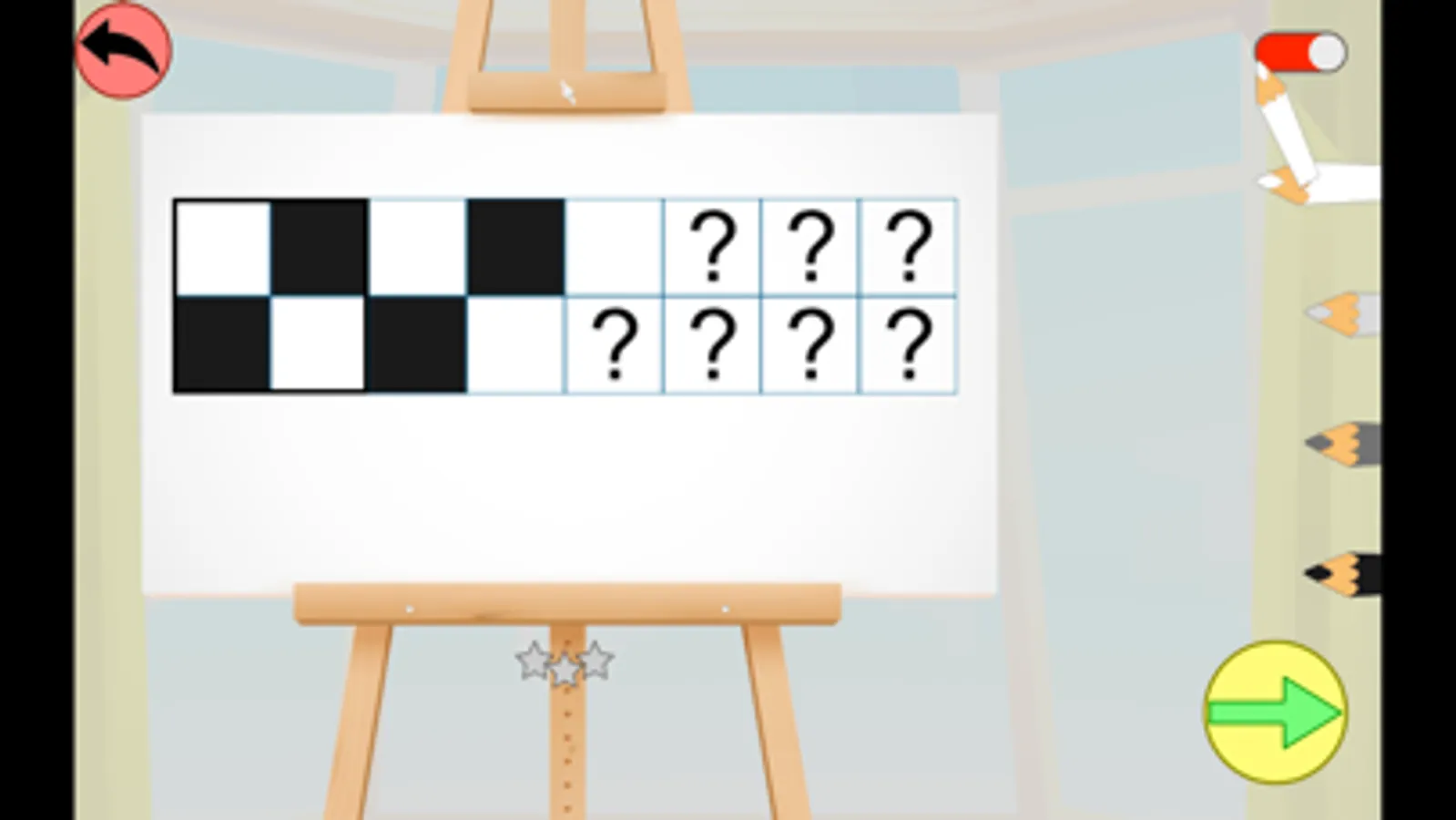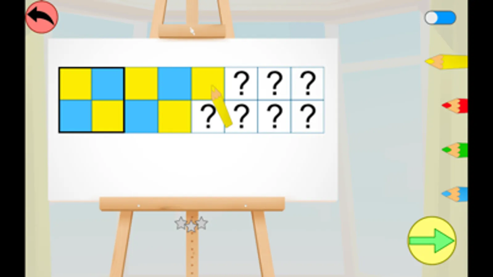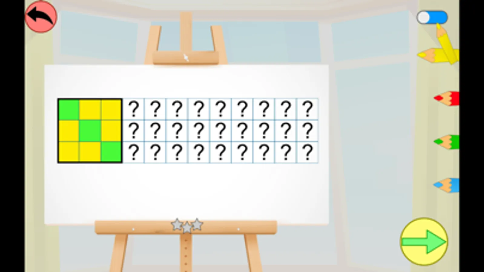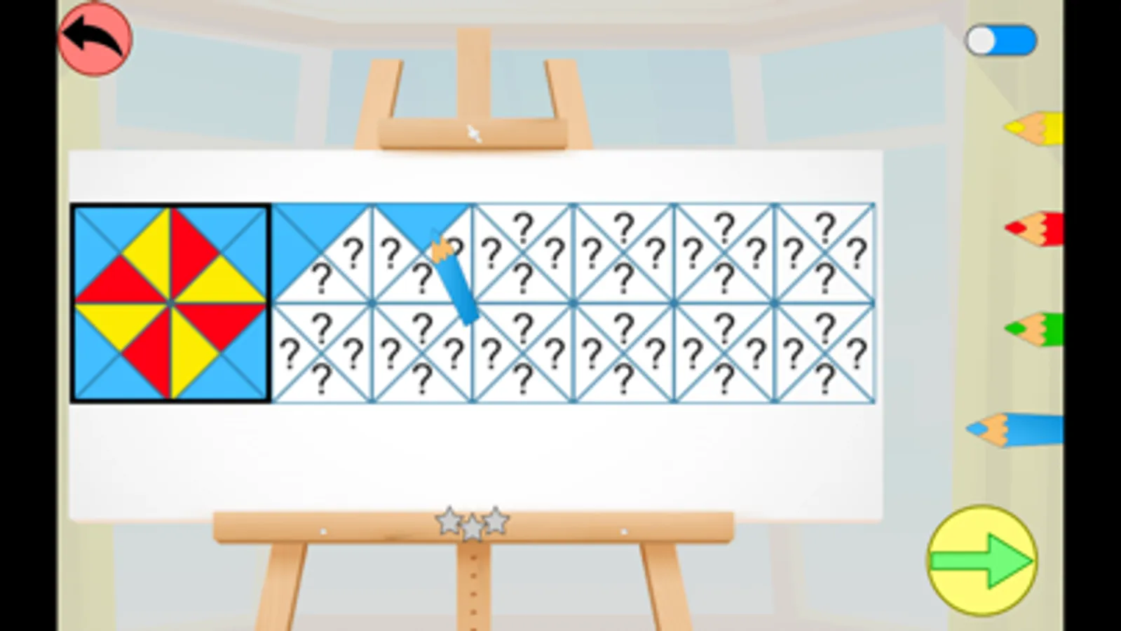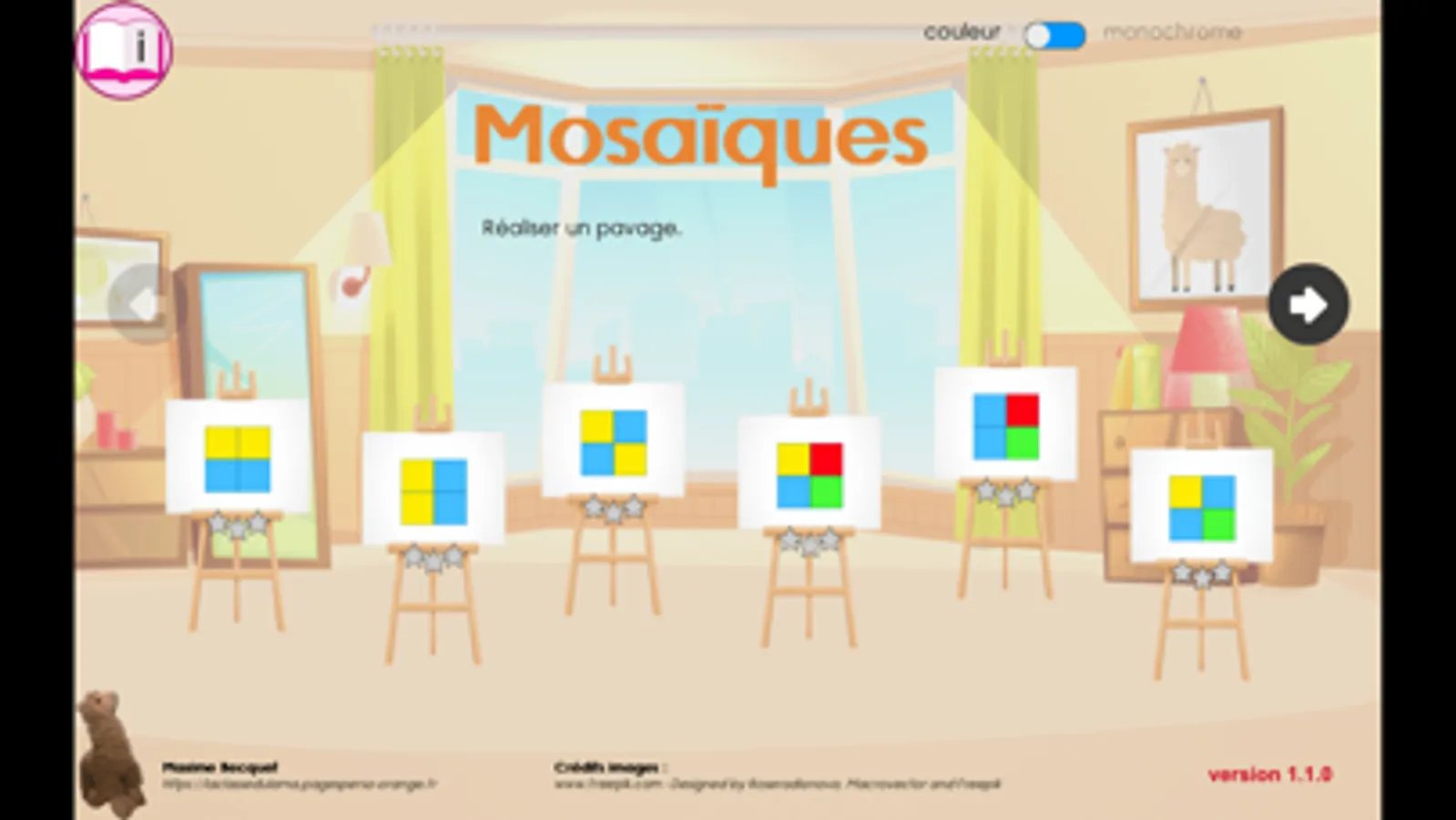 3 niveaux sont proposés, et l'enfant peut gagner entre 1 et 3 étoiles selon le nombre de tentatives nécessaires pour réussir chaque pavage.