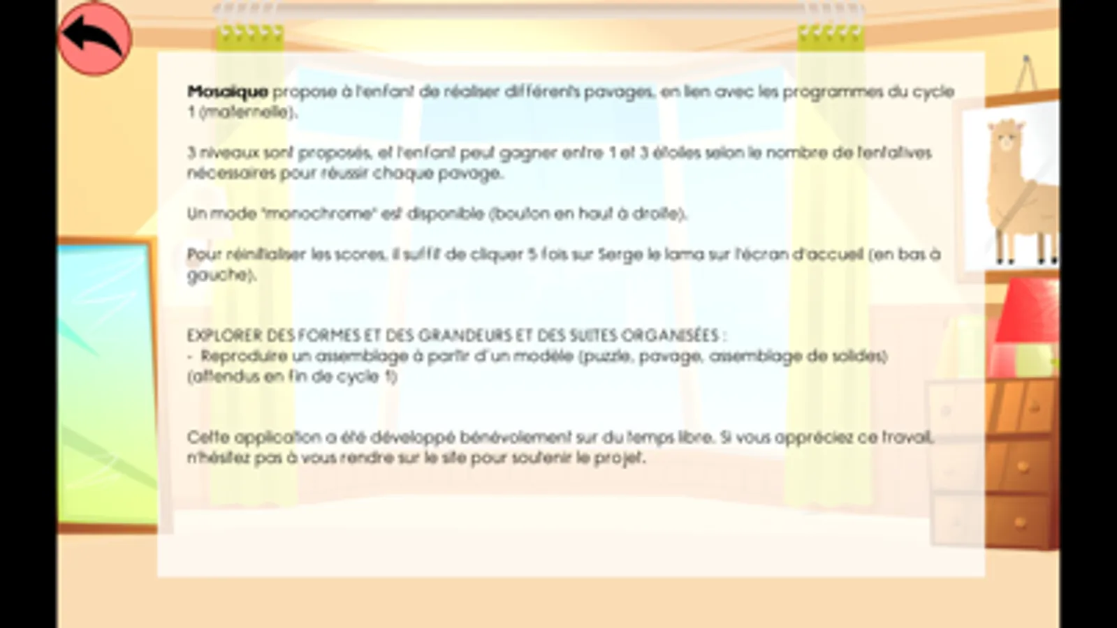 Mosaïque propose à l'enfant de réaliser différents pavages, en lien avec les programmes du cycle 1 (maternelle).