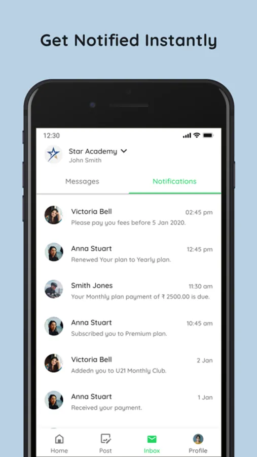 Inteam is an app for subscribers of gyms/studios or students of coaching academies to view their purchased plans, attendance, transactions, performance reports and messages.
