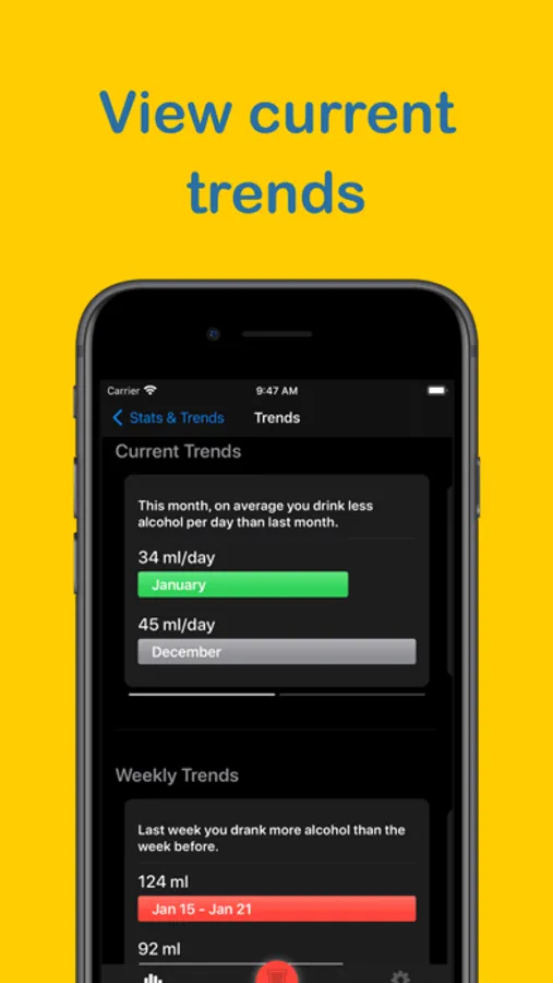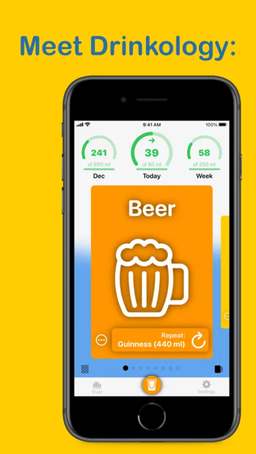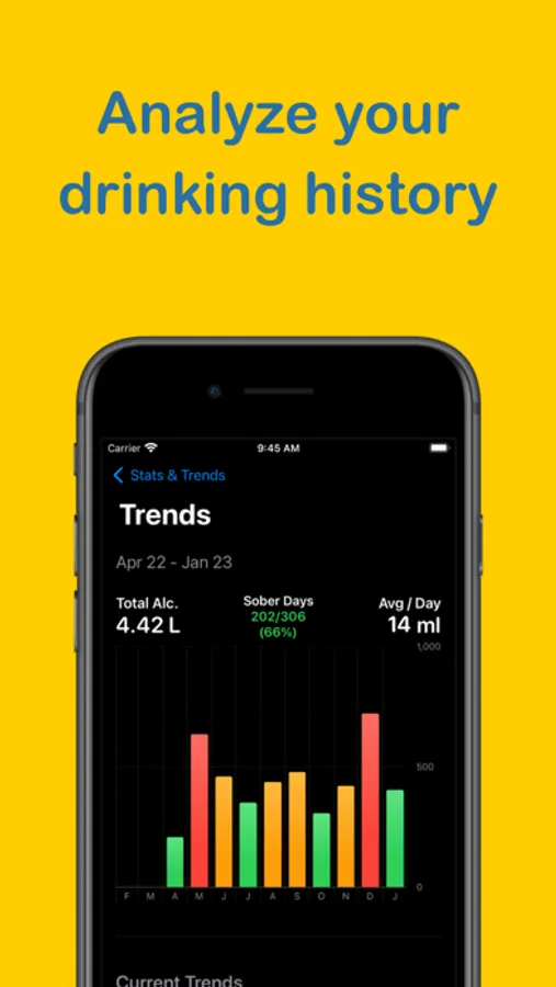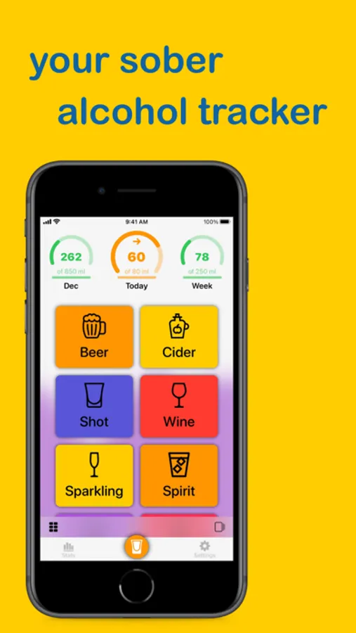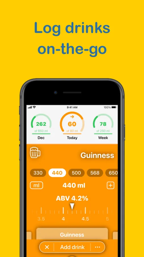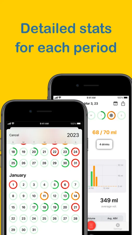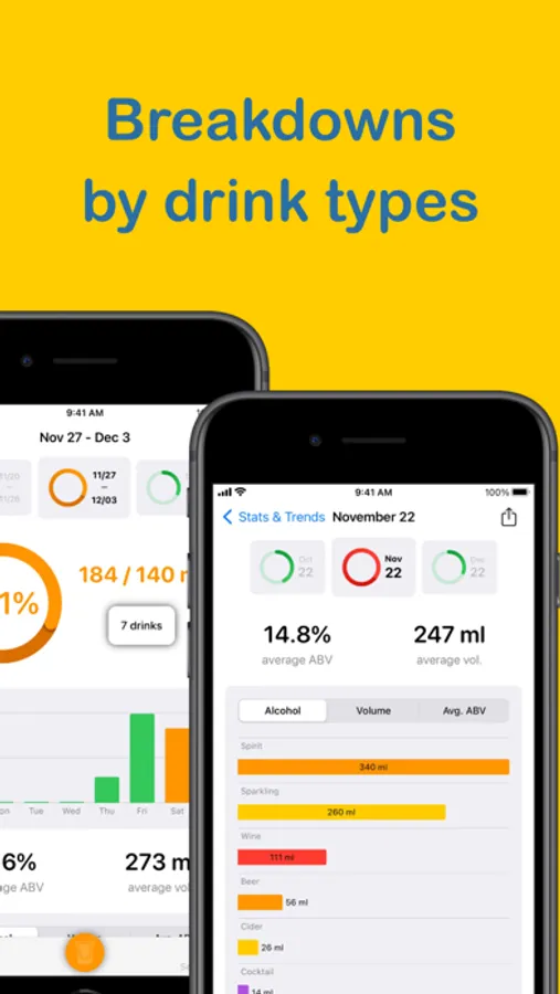 - tracking your alcohol consumption history with detailed statistics, including average values and breakdowns by types of drinks