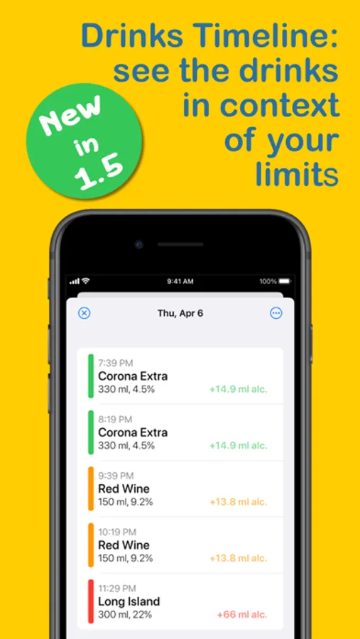 - "Drinks Timeline": view all drinks from day, week or month in context of your limits with colored bars that depict each drink's impact