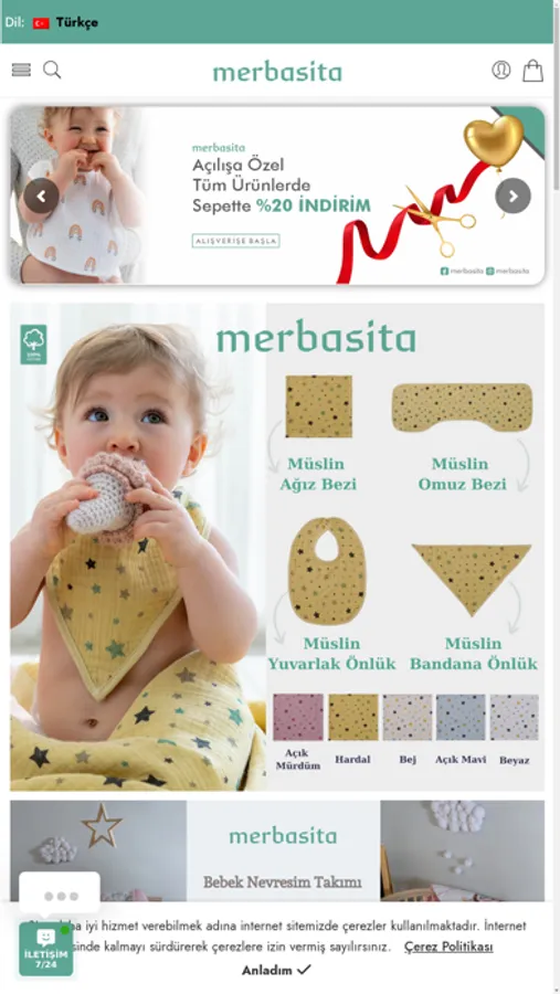 Siz değerli müşterilerimizin her daim yumuşacık müslin bezi ellerinizden düşürmemek adına Merbasita App Store’da yerimizi aldık. Merbasita uygulamasını indirerek %100 doğal pamuktan imal edilerek yumuşacık müslin bezden üretilen ürünlerimizi keşfedebilirsiniz.