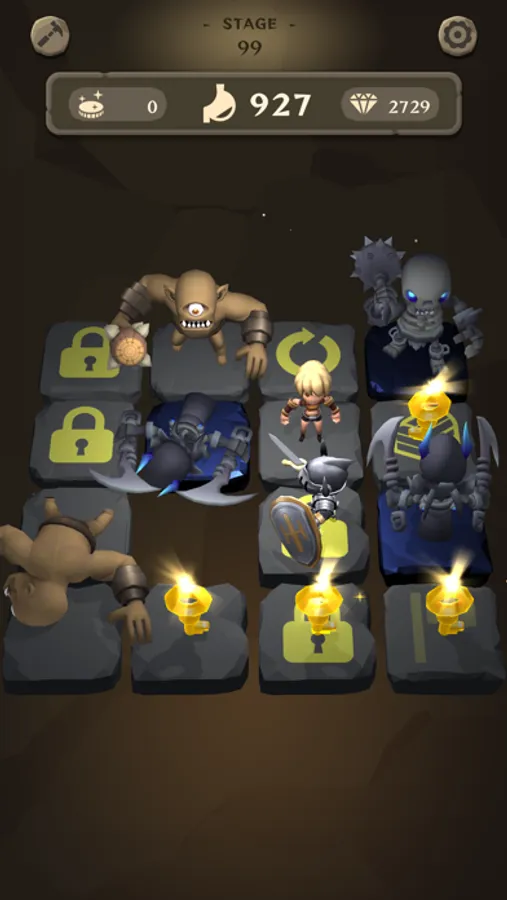 This is a slide puzzle with roguelike elements in which monsters, travelers, guards, and traps are placed on the panels.