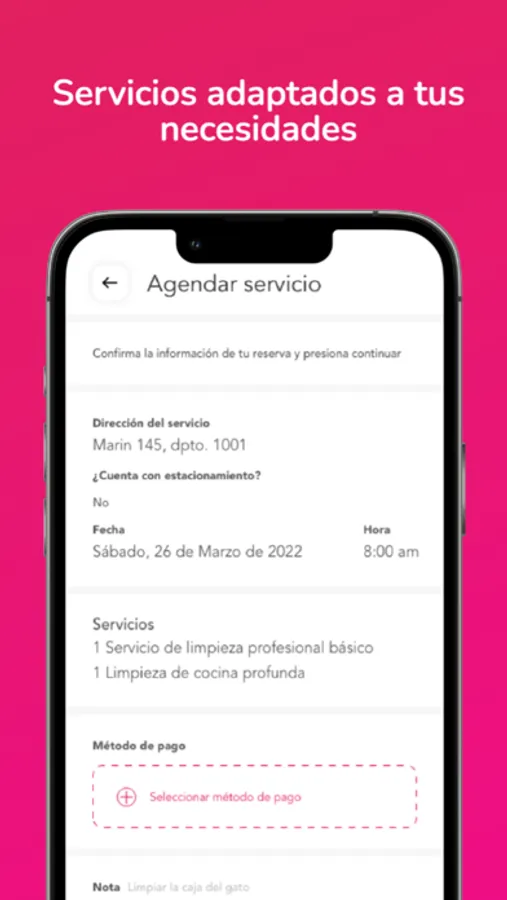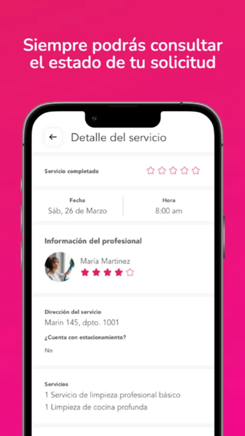Desde la app podrás solicitar a un profesional la limpieza manual para tu hogar u oficina, seleccionar la fecha del servicio, el tipo de servicio según tus necesidades y tamaño del domicilio.