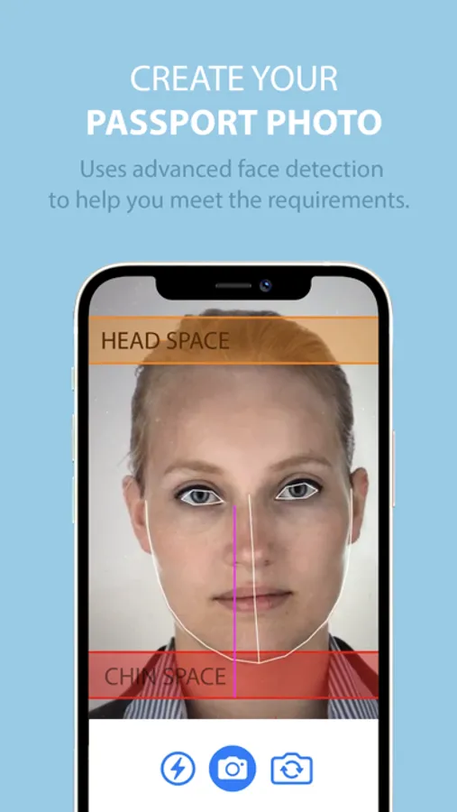 Use advanced face detection to take passport photos, which follows all required guidelines for a biometric photo. Simply use the camera, and the advanced face detection will show you how to align your face perfectly. Resulting photo can be immediately shared or printed in various formats.