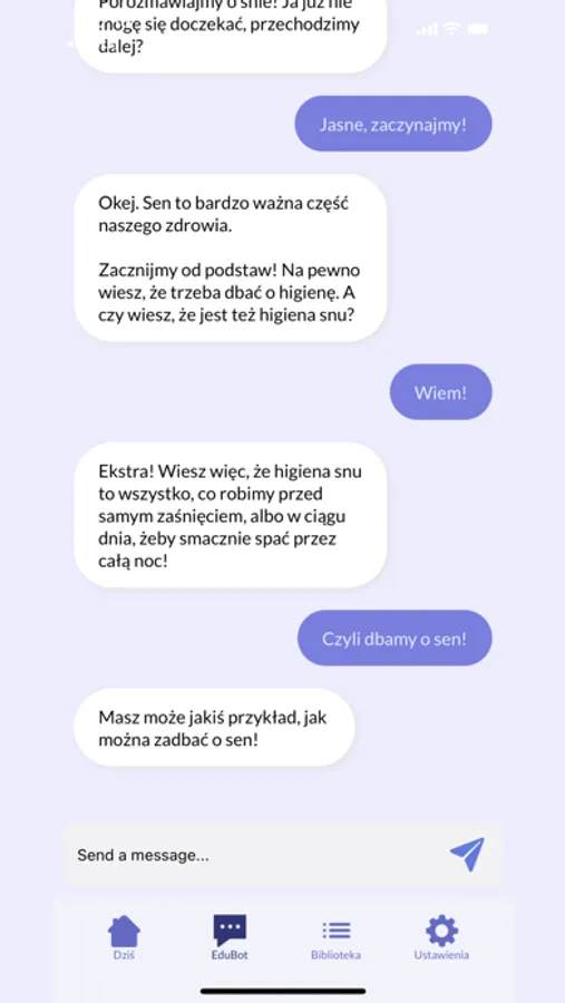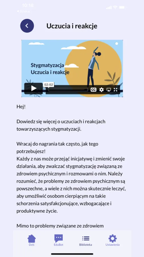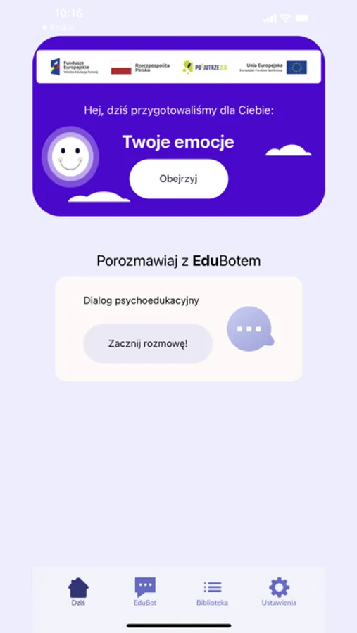 EduBot to Twój osobisty przewodnik po wiedzy na temat zdrowia psychicznego. Zapozna Cię z technikami zdrowego zarządzania swoimi myślami, uczuciami i zachowaniami. Otrzymujesz dostęp do bezpłatnego źródła wiedzy i poznania możliwych środków wsparcia z obszaru psychoedukacji ze szczególnym uwzględnieniem wsparcia środowiskowego i czynników wpływu otoczenia. Dowiesz się, jak rozpoznać objawy najczęściej występujących zaburzeń psychicznych, jak pomóc sobie i innym oraz do kogo zgłosić się z problemem.