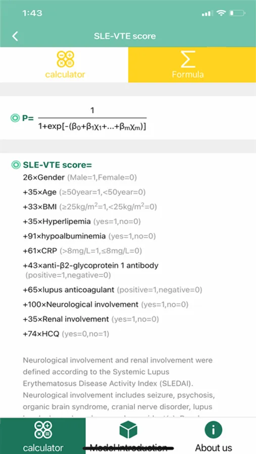SLE-VTE score is a clinical prediction model to help physicians and researchers predict the risk of venous thromboembolism (VTE) in systemic lupus erythematosus (SLE) patients. This model is built and validated based on the Chinese SLE Treatment and Research group cohort (CSTAR). Logistic regression and least absolute shrinkage and selection operator were used to fit the model. The final prediction model (SLE-VTE score) included 11 variables: gender, age, body mass index (BMI), hyperlipidemia, hypoalbuminemia, C-reactive protein (CRP), anti-β2-glycoprotein 1 antibody, lupus anticoagulant, nervous system involvement, renal involvement, and hydroxychloroquine usage. We hope and welcome more cohorts to further validate and improve this model