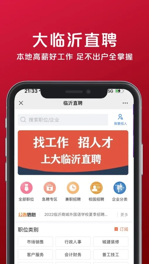 【大临沂直聘】是一款临沂本地综合型求职/招聘APP。