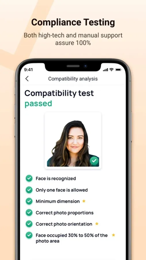 ● 100% guarantee of approval. AI technology and extra checks by our experts will ensure that your passport photos can be approved by the authority. You will not be charged until your photos are perfect.