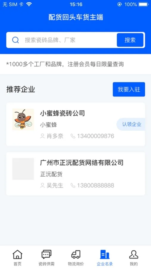 配货回头车货主端是一款为货主发货服务的软件。货主完成企业认证后,可对运单进行询价并发货,查看运单的承运进度、结算信息,对运单发表评价。货主可发布供应或者求购的瓷砖产品信息,与其他货主进行交流。货主还可查看瓷砖行业相关的企业通讯录。