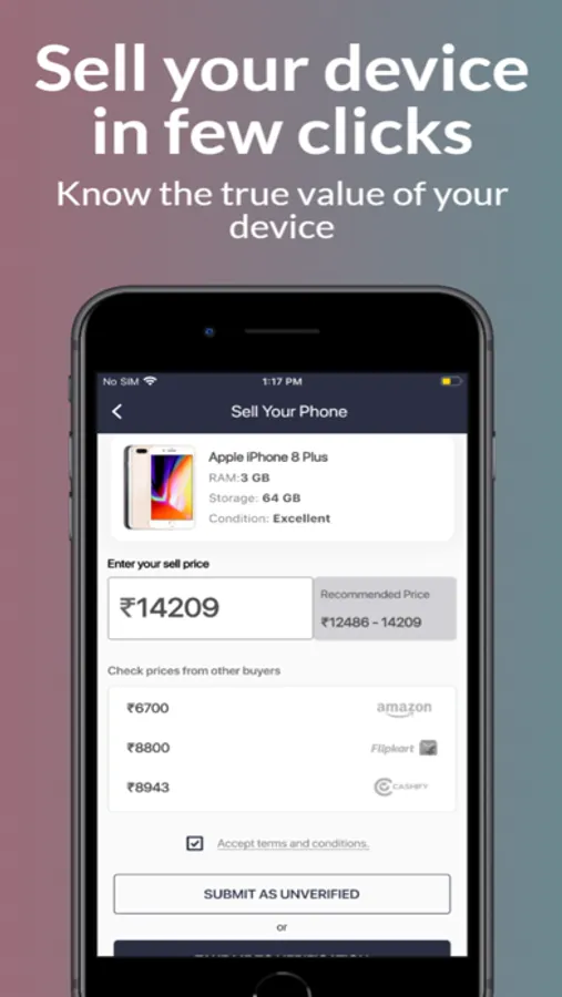 You just have to download the app on the device you are willing to sell. Now, register yourself on the platform using your mobile number. Select the (+) highlighted icon at the bottom of the screen to add your device on the platform.Fill all the required details of your device along with some photos. Then, verify the condition of your mobile through our verification process (A number of high-performance automated tests will be run on your device). After verification, the app will automatically provide your mobile a grade (Like New, Excellent, Good, Fair, Needs repair) based on its condition.