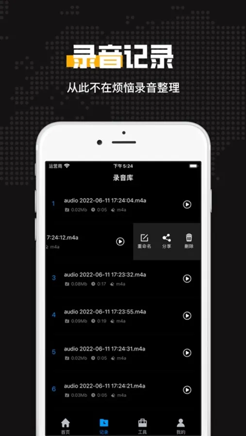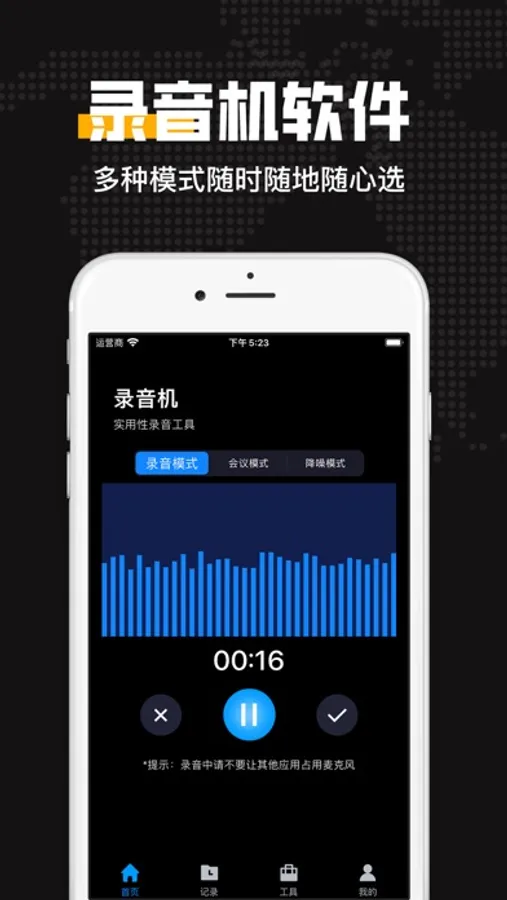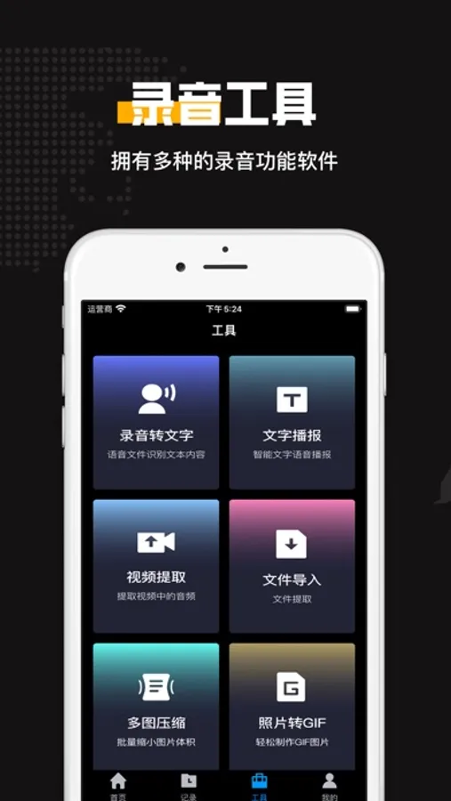 一款实用性的录音工具,支持多种模式,支持长时间录音。本地录音库随时查看,支持音频文件的导出、重命名、删除等。支持录音转文字、文字播报、视频提取音频、文件导入音频、多图压缩、照片转GIF、证件拼图、扫描二维码识别等实用功能。