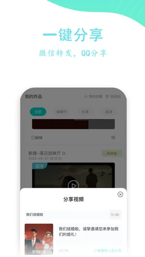 -「免费制作」每位用户均可免费创5个视频,超出5个后可以删除不需要的再继续创作,每个视频免费输出5次标清,可免费分享!