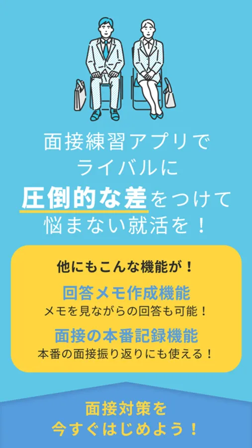 新卒の就活生向けの面接対策アプリ!面接の受け答えに悩んでいる、面接に苦手意識がある、そんな就活生に最適のアプリです。