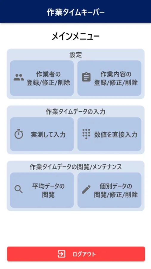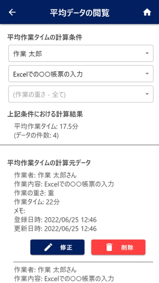 4. 「平均データの閲覧」で作業者や作業内容、作業の重さごとにかかった時間の平均(=同様の作業にかかりそうな時間)を閲覧。