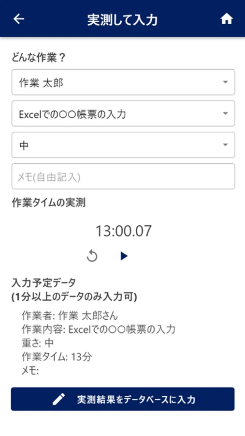 3. 1. (ストップウォッチで実測したい場合)「実測して入力」で、作業者と作業内容を指定して時間を実測→入力。オプションで作業の重さやメモも付記可能。