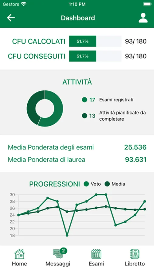 • Calcolare e visualizzare i grafici sulla media degli esami e sul voto di laurea di partenza