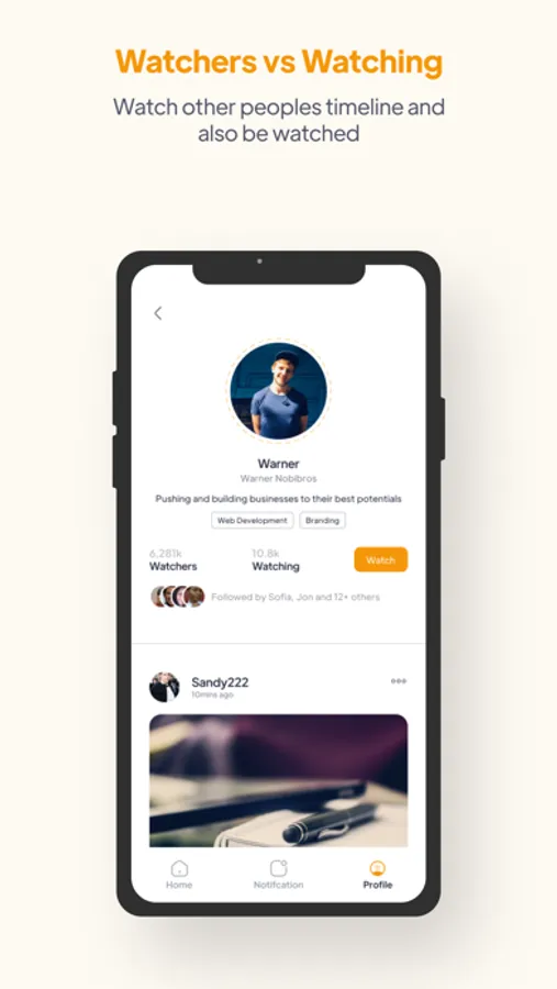 Introducing you to watchers. Watch your friends and favorites celebrities and influencers for live updates on the latest activities they share.