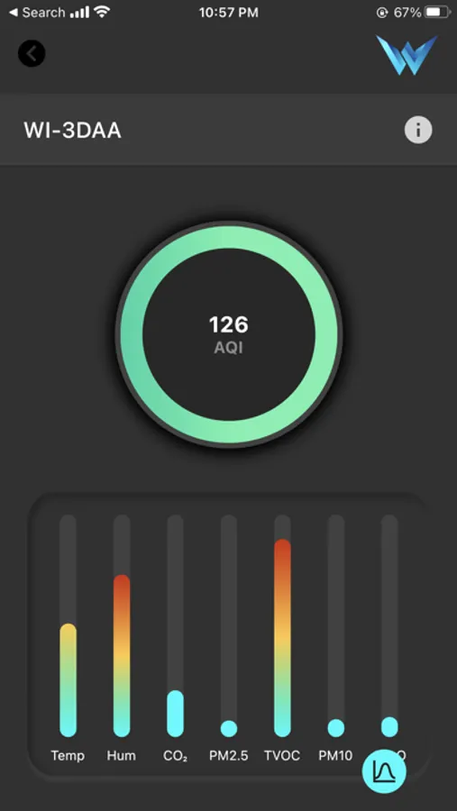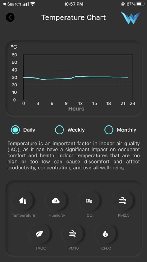 Visualize your environment's trends and changes over time with interactive graphical charts. Explore daily, weekly, and monthly historical data to gain deeper insights into patterns and variations in your indoor air quality.
