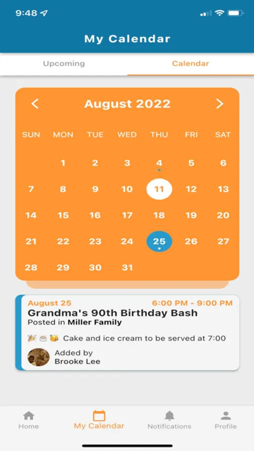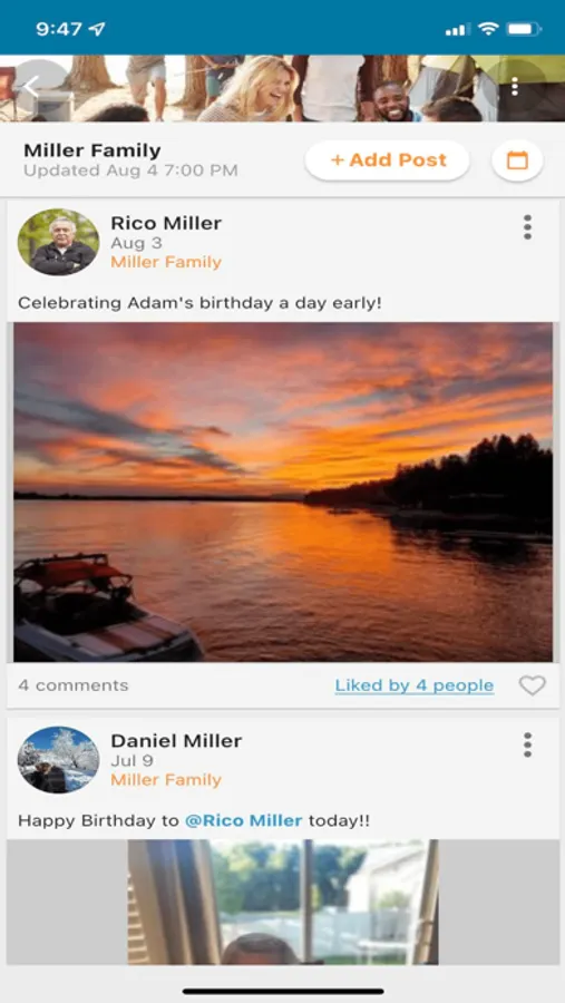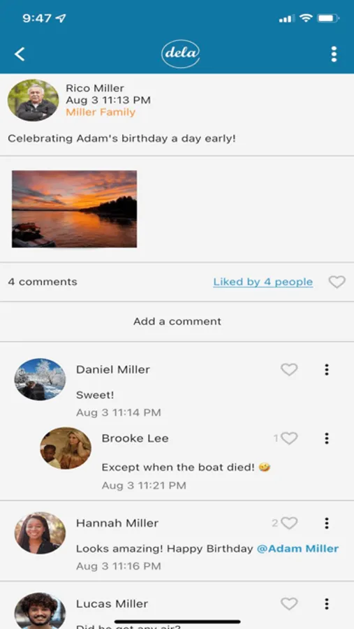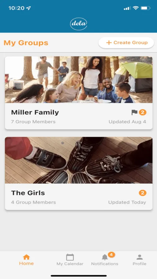 Dela users join private groups where they can post photos, videos, and written messages, and then comment on the posts shared by others. Dela groups also have a shared calendar used to track important dates and plan group events.