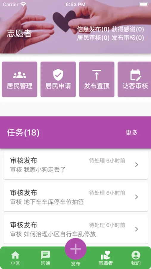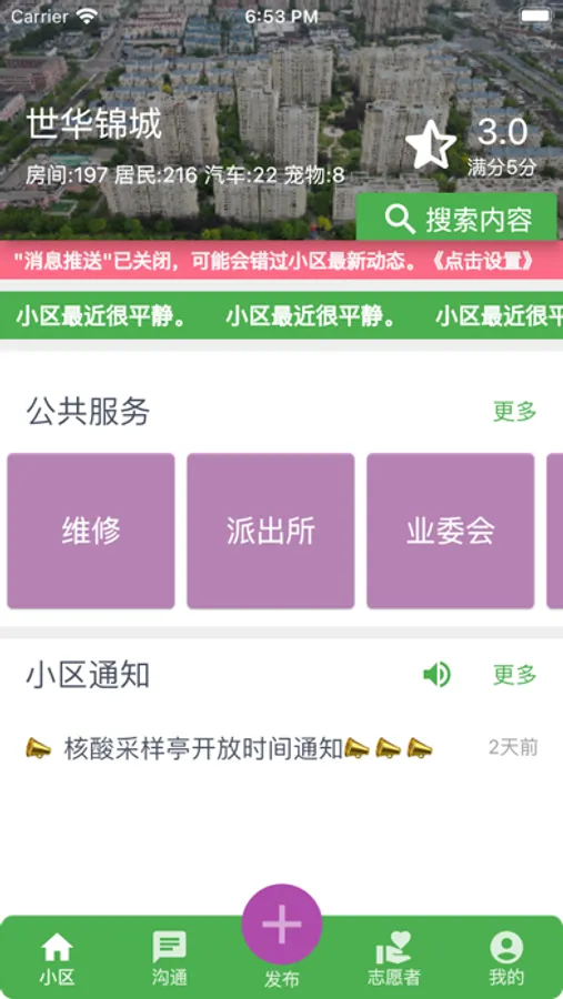 志愿者者可以向全小区,或部分楼宇发送消息提醒。选定范围的居民可以收到消息提醒,志愿者还可以看到用户反馈。