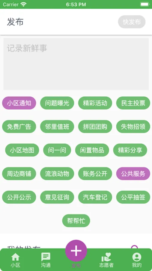 小区自治更高效!小区自己的信息中心。居民参与,小区志愿者审核维护。主要功能: