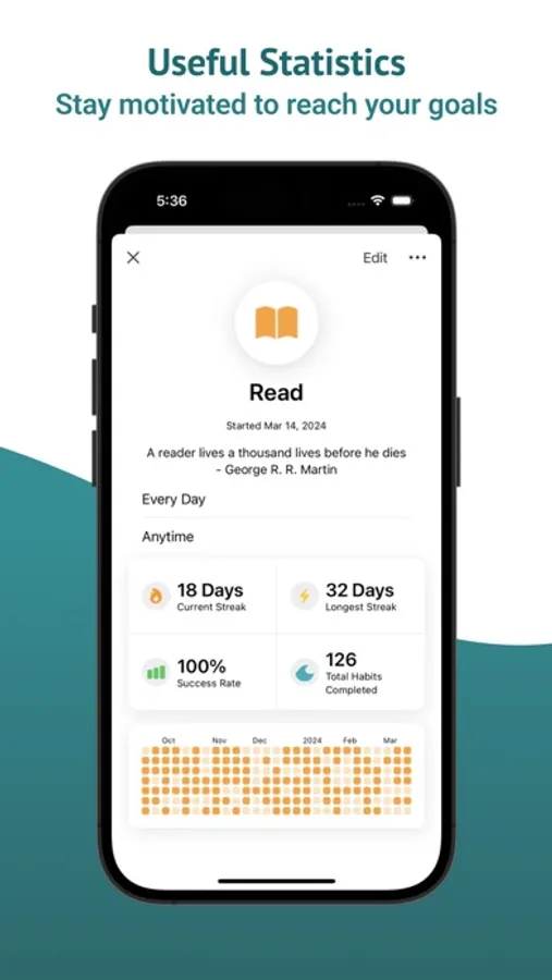 View your progress at a glance with an intuitive calendar and weekly views with wave icons to keep you productive. There's also a yearly grid to quickly view progress for the entire year.