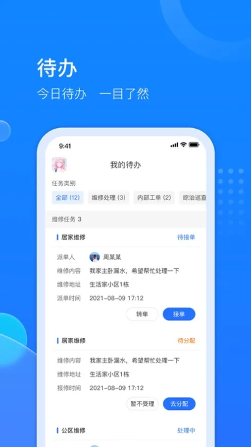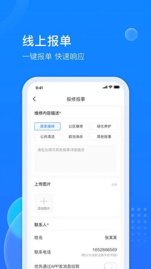 1.线上报单报事:业主或工作人员可以在线上便捷快速报单,然后在待办中快速处理工单。