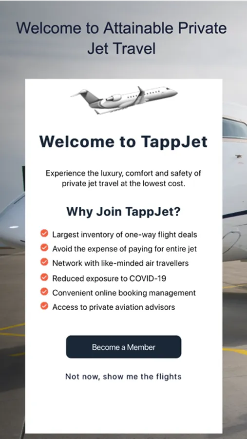 Introducing Tappjet, where luxury meets practicability. Our innovative business model revolutionizes private air travel by promoting responsible and efficient private travel while also providing flexible fliers with an alternative way to book trips without the hefty price tag - through monetizing their surplus seats!