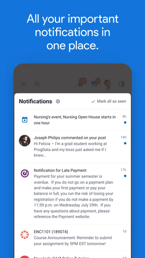 - Receive key notifications from Banner, Canvas and Registrar, EAB Navigate